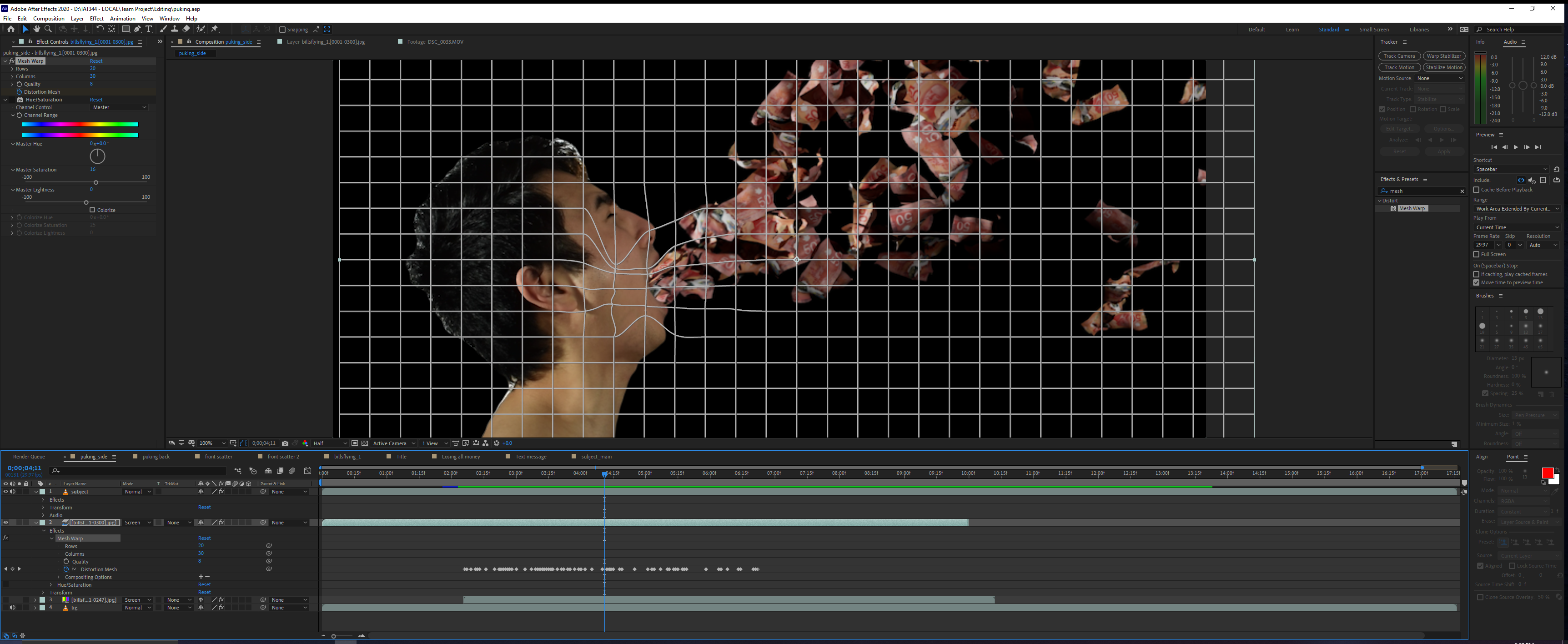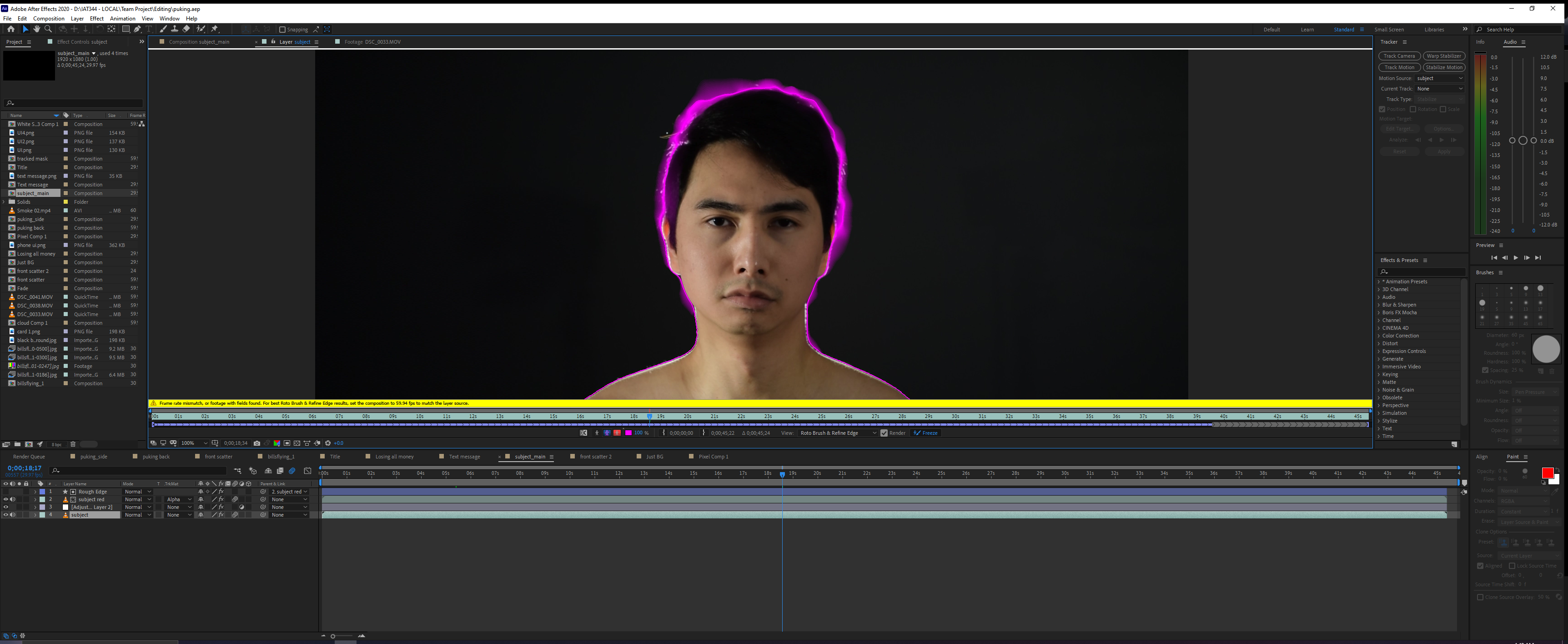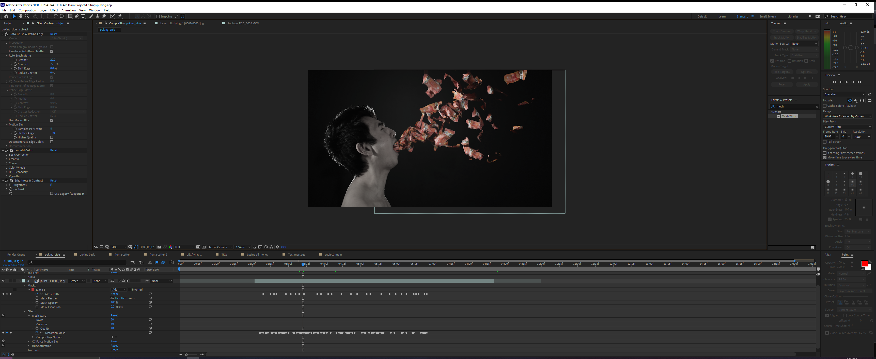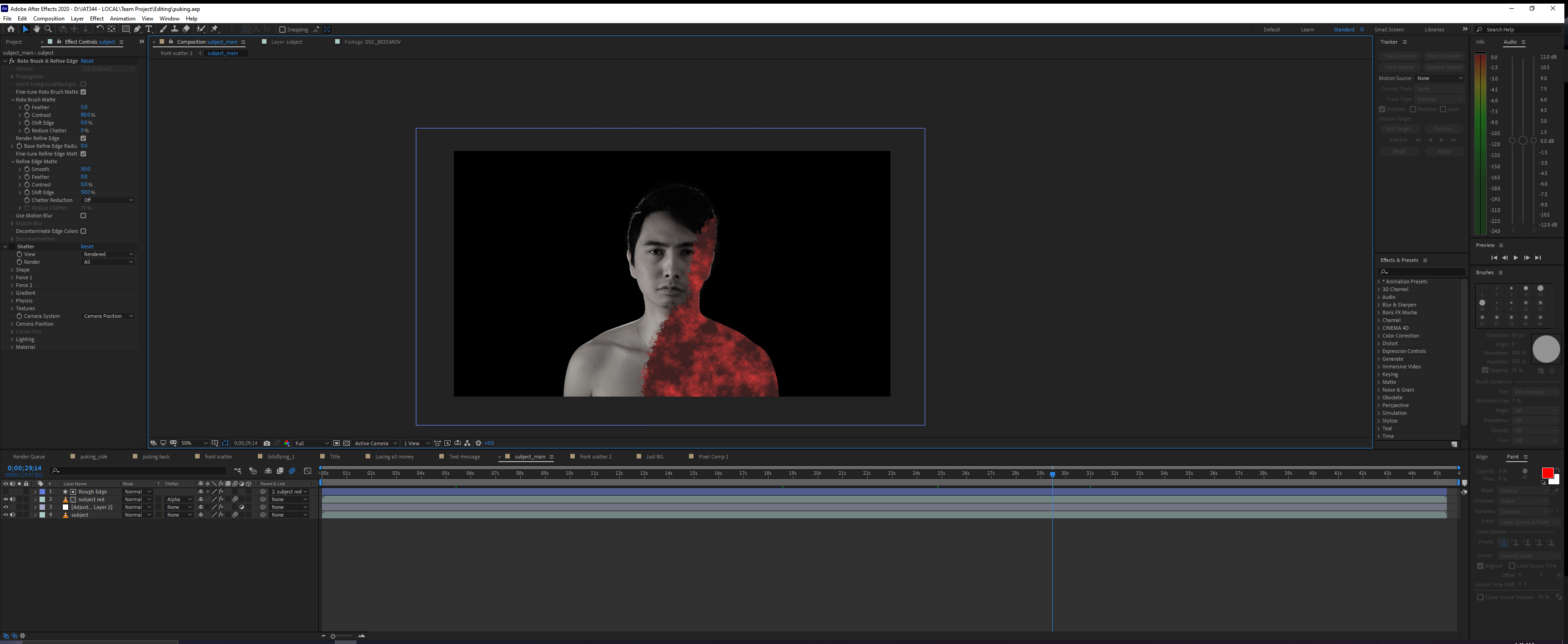Another visual effect that I made was the shattering effect. I rotoscoped my body to separate myself from the background in After effects so that only my body disintegrates and not with the background. However, I realized that we didn’t take a photo of the background which will leave an empty hole behind the subject, so I used Photoshop to manually remove my body and painted the background using the stamp tool.