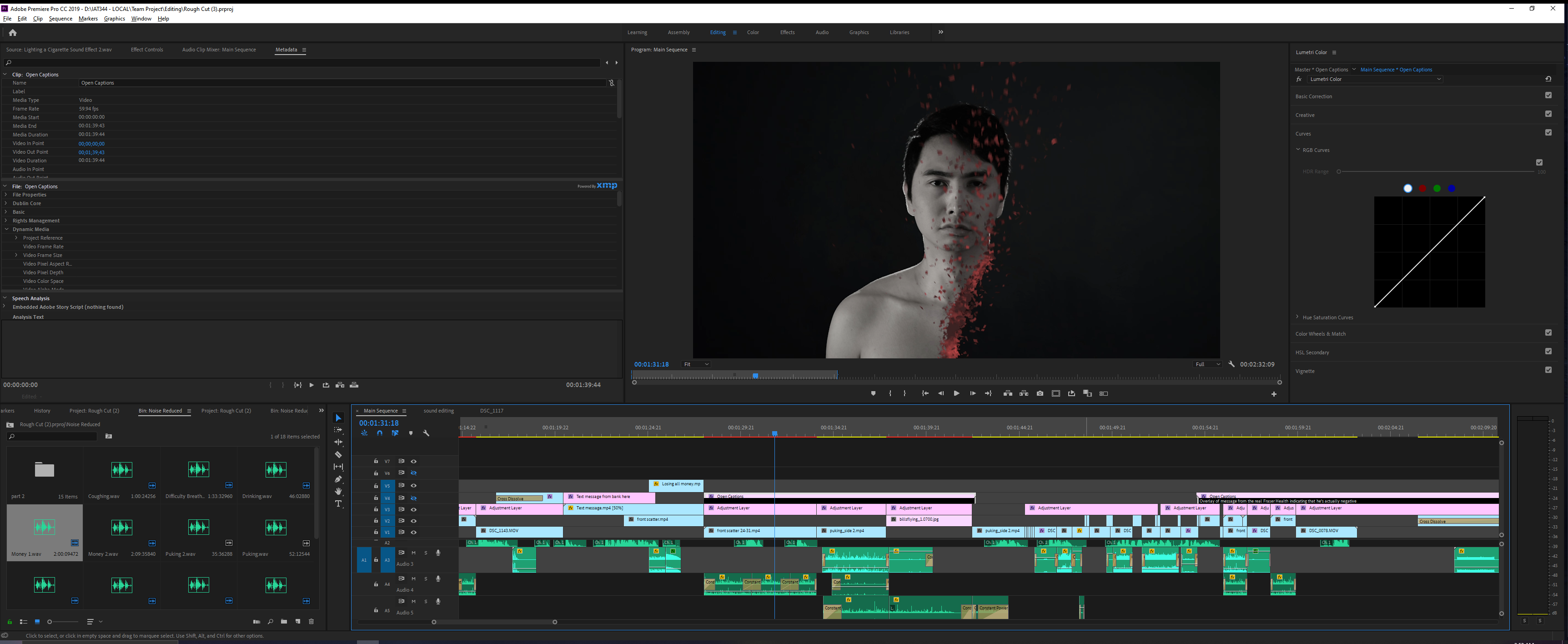 After I recorded the foley sounds and voice-overs, I edited them in Audacity. Although the sound studio was completely quiet, the microphones that we used were too sensitive enough to record noises that I couldn’t hear with my ears. Hence, I used the noise removal effect in Audacity to remove noises. Then, I imported the sound effects and voice-overs into Premiere Pro and edited the sounds there through trimming and volume adjustment.