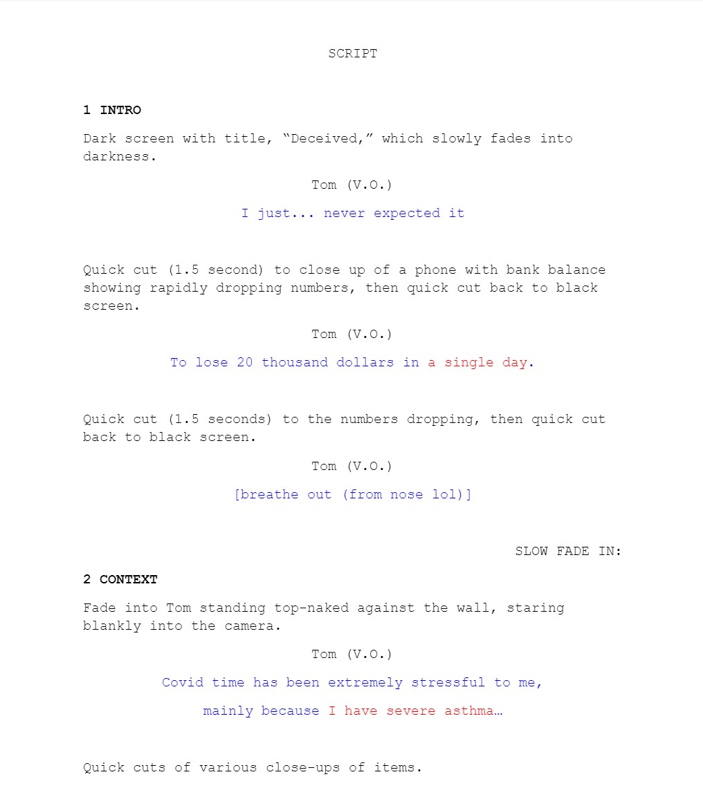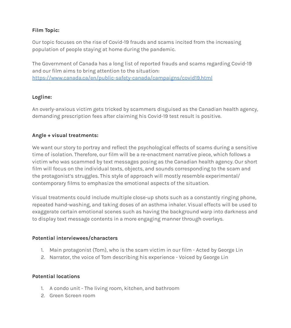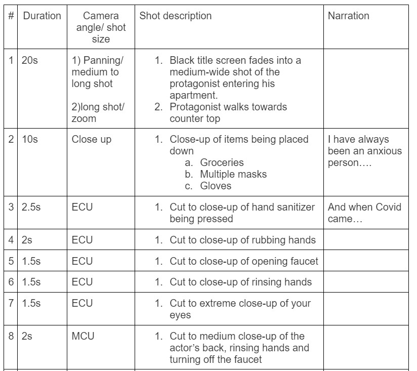 In the early development stage, we started the project with a story treatment that lays out the concept of the film. Then, we planned out our shot list, script, and moodboard together, in which I led how the cinematography should be for each shot. Throughout this time, we received feedback and iterated on them.